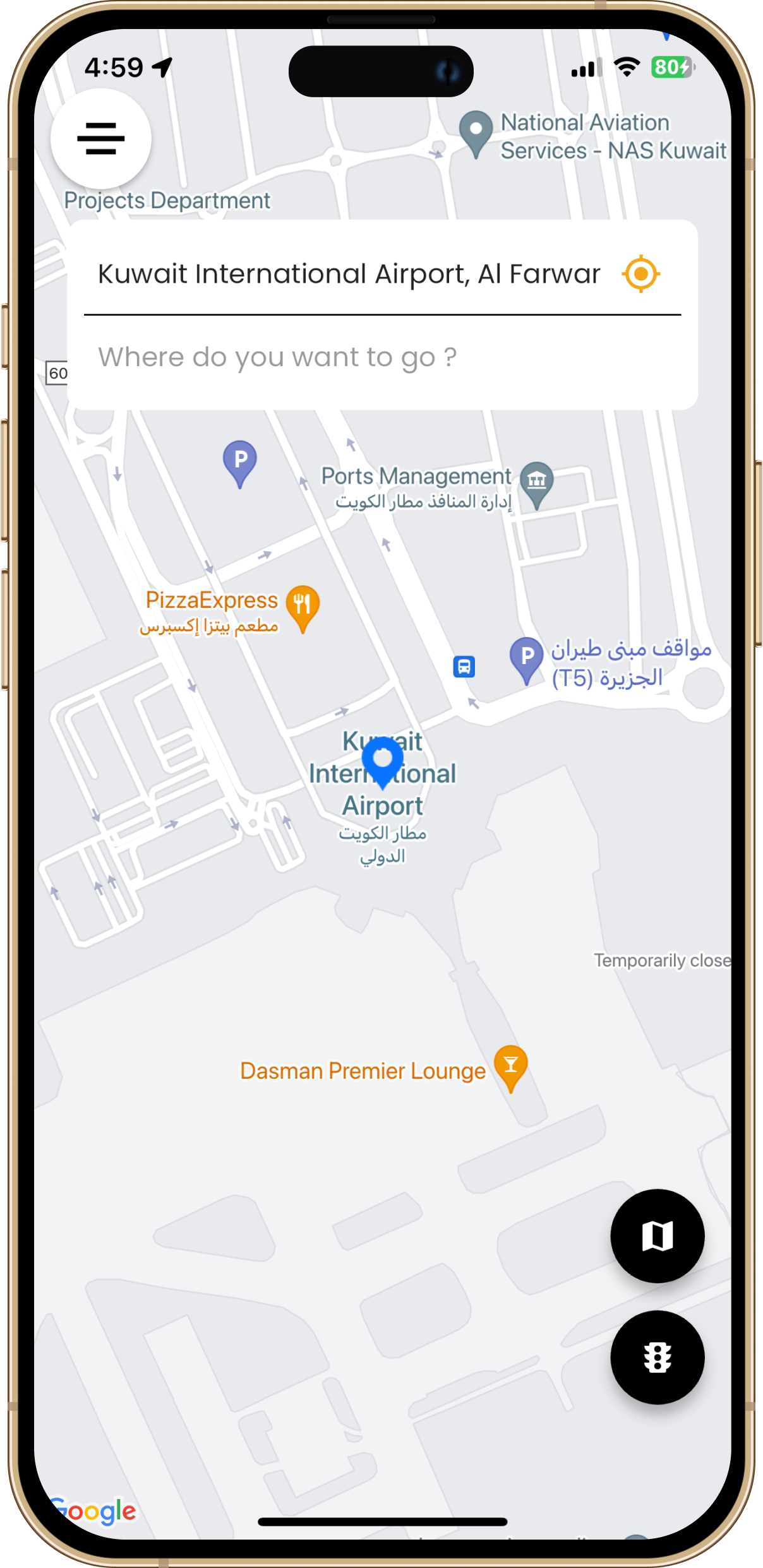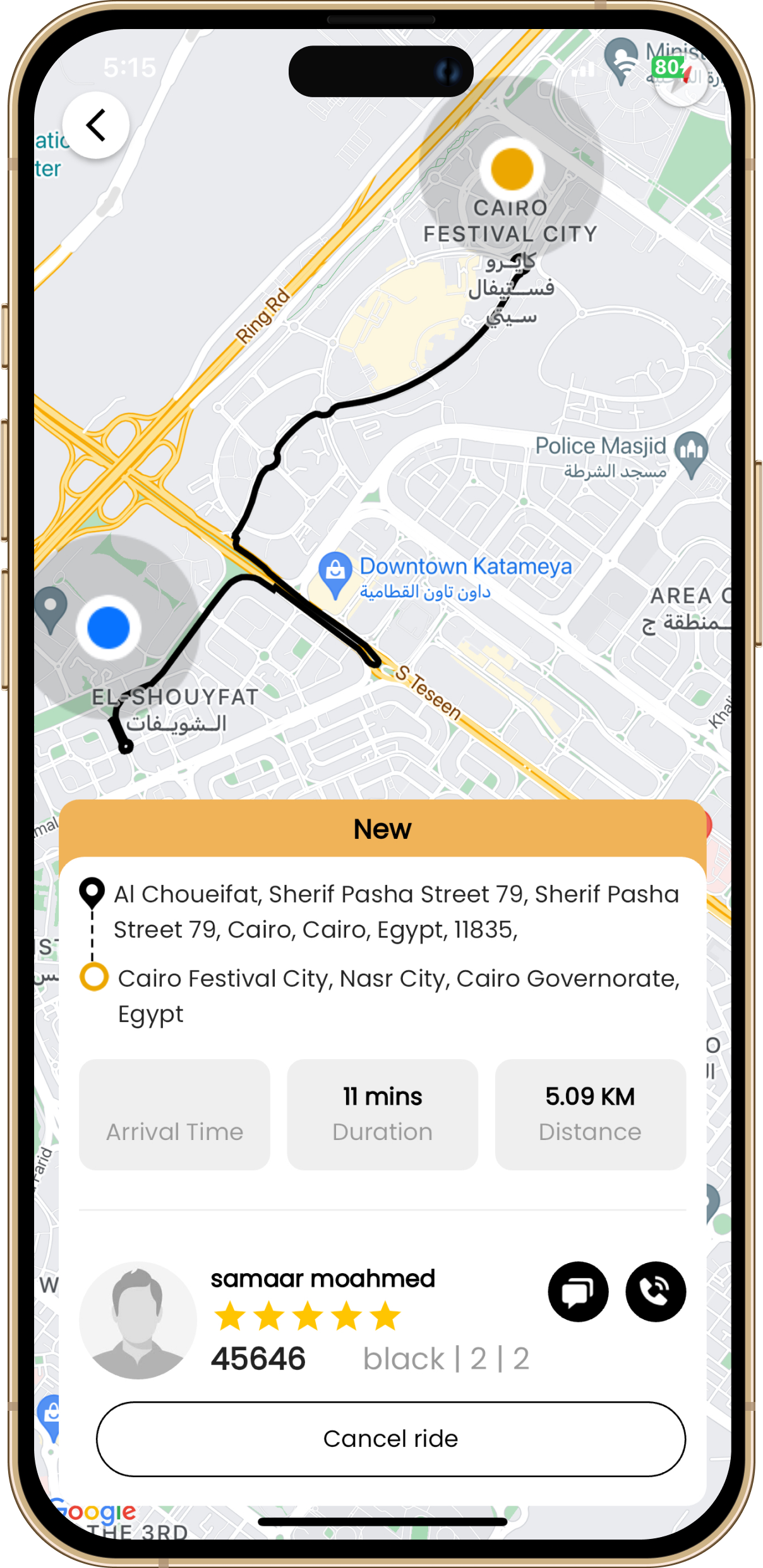 يوفر تتبعًا في الوقت الحقيقي لموقع السائق على الخريطة، مما يتيح للمستخدمين رؤية مسار السائق والوقت المتوقع للوصول. كما يعرض المسار الذي سيراه السائق للوصول إلى الوجهة.