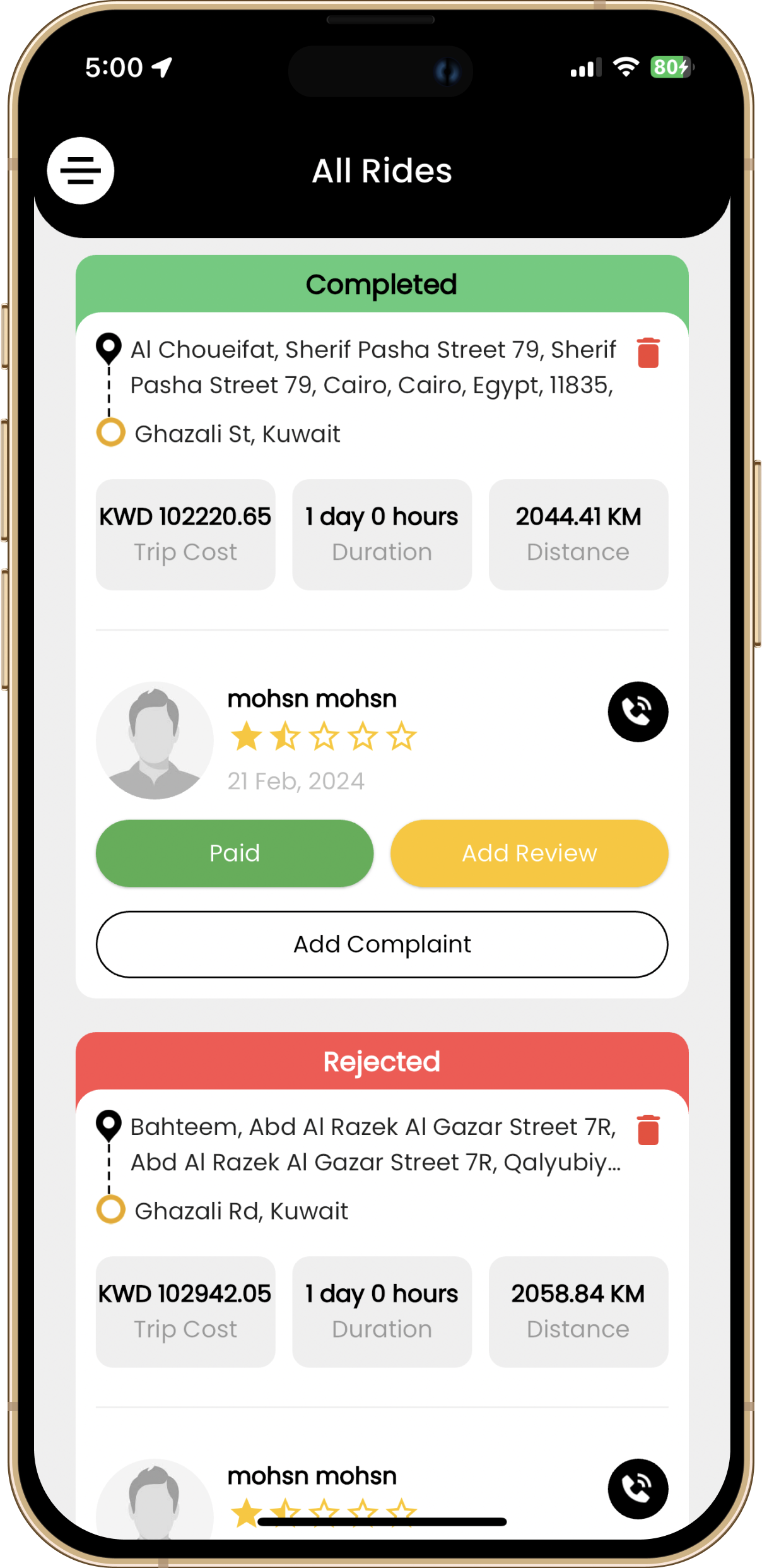 يمكن للمستخدمين عرض تفاصيل مفصلة عن رحلاتهم السابقة، بما في ذلك تفاصيل الرحلة، تفصيل التكلفة، والفواتير.